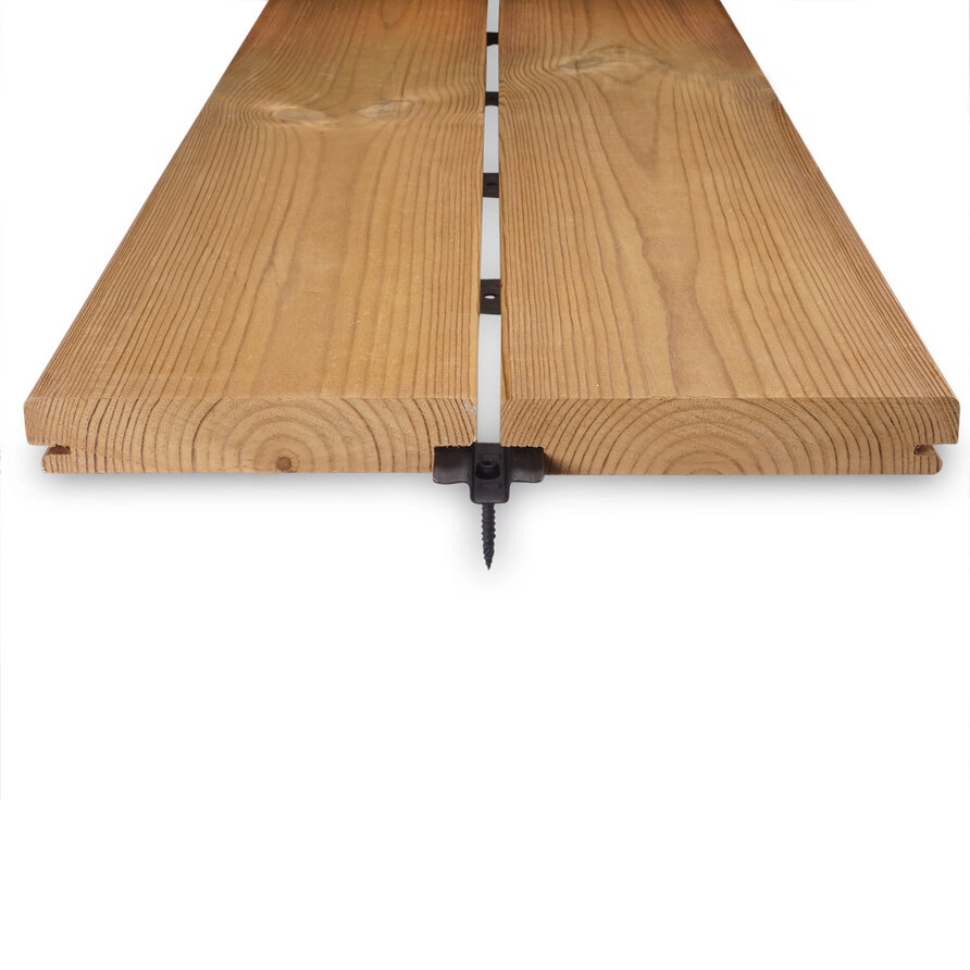 LET OP: Deze zwarte clips zijn speciaal ontworpen om planken bij de kopse naden te bevestigen, waarbij 3 of 4 planken worden samengevoegd. Als u echter slechts twee planken aan elkaar wilt bevestigen, kunt u de standaard B-fix One clip gebruiken.