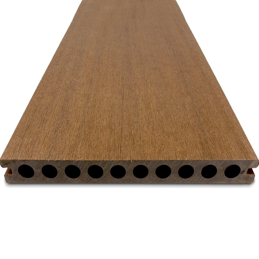 Composiet terrasplank - hol (semi massief) - teak uitstraling - 23x210 mm - 1 zijde geschaafd / 1 zijde geborsteld (optiek) - vlonderplank met blinde bevestiging - houtcomposiet