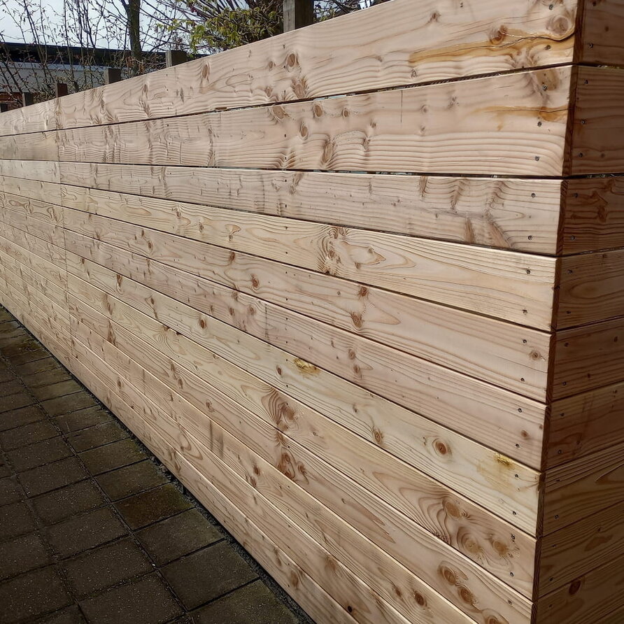 Wij leveren tuinhout, dat nog bewerkt & verwerkt zal worden. Douglas bevat (kleine) noesten, incidenteel ook los / uitvallend, (droog)scheuren, mogelijk wat hars aan het oppervlak en mogelijk wat onaangetast spint en ingesloten hart. Het douglas hout heeft ruwe uiteinden (ingekort met kettingzaag) en een overlengte van 1 - 10 cm. Geschaafd hout is - t.o.v. ruw / fijnbezaagd hout - glad & vrij vormstabiel, houd wel rekening met geringe maatafwijkingen door werking van het hout. Het betreft KD 18-20% hout, oftewel kunstmatig teruggedroogd hout met een vochtpercentage van 18-20%. Dit hout is - t.o.v. AD hout - vrij stabiel, echter dient u altijd rekening te houden met werking van het hout.