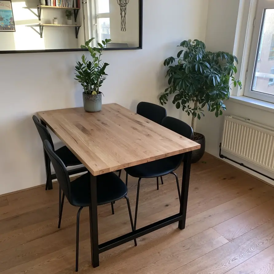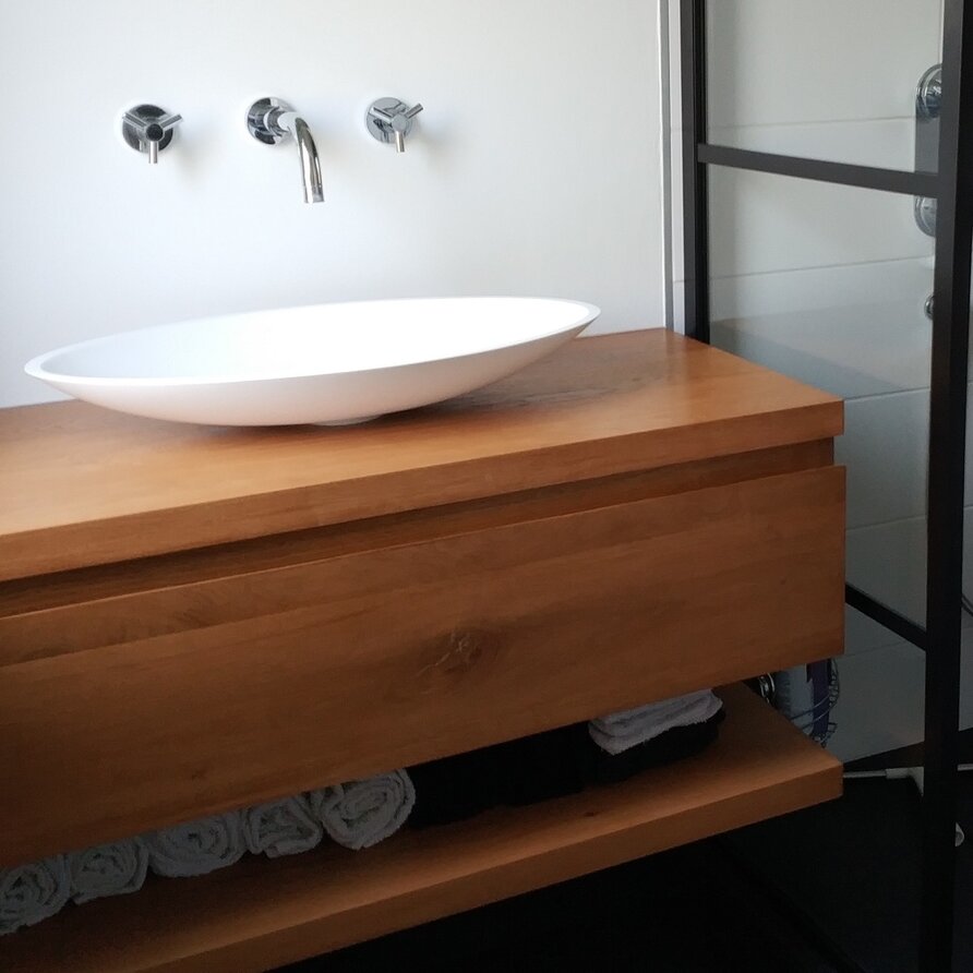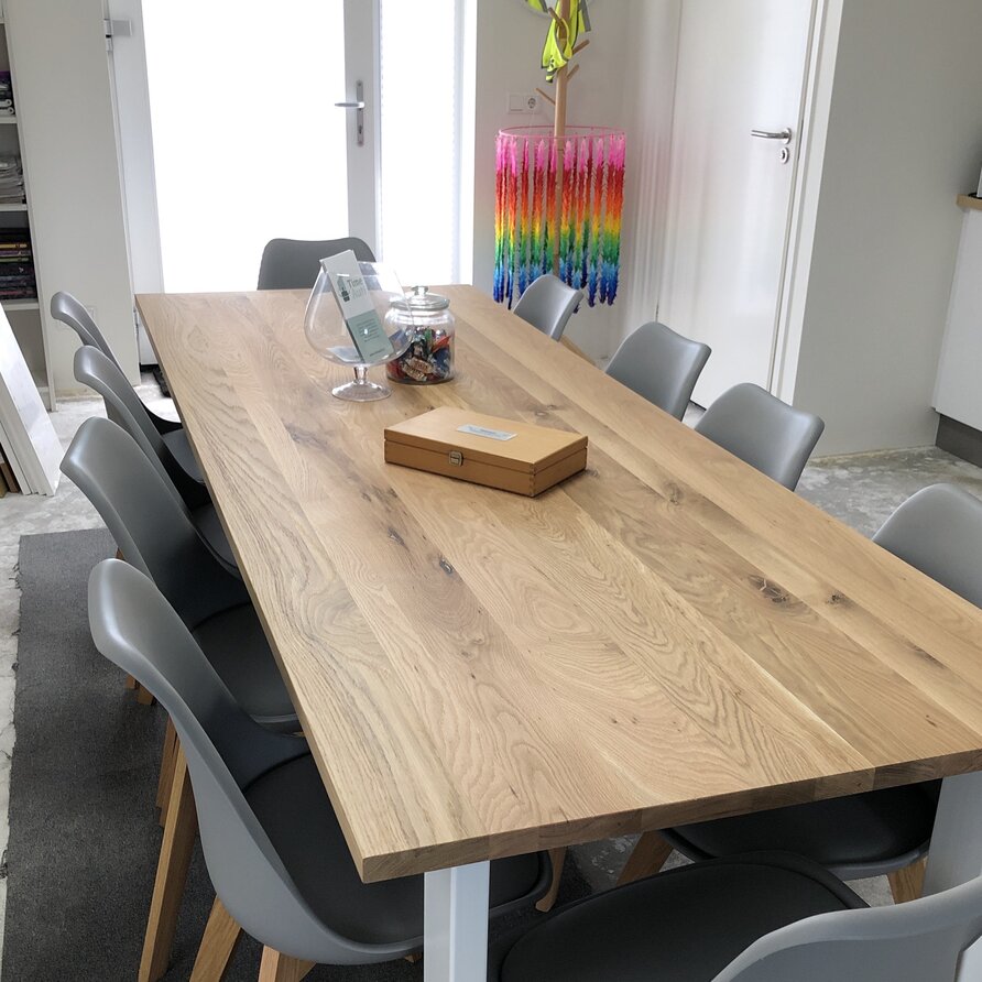 Eiken blad (voor binnen) op maat. Massief eikenhout rustiek KD 8-12% - 3 cm dik - Eiken paneel / blad ambachtelijk verlijmd - met doorlopende lamellen - Optioneel: noesten gevuld / behandeld (olie/lak) / stalen profielen / tafelblad kanten / geborsteld. Lees meer