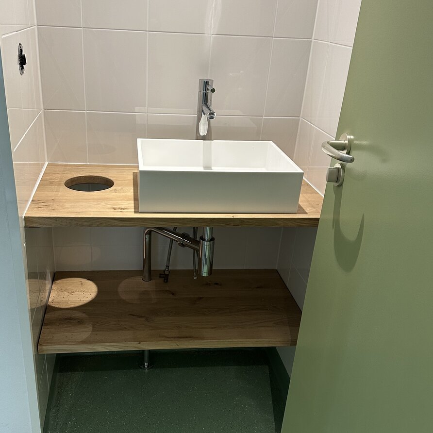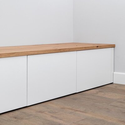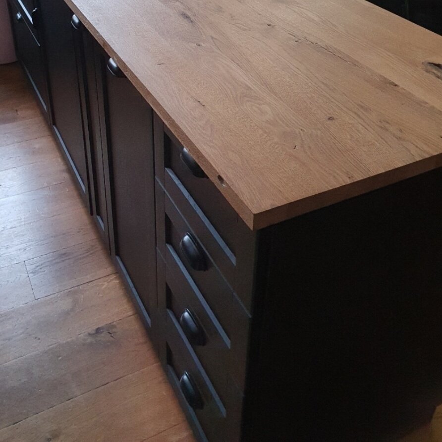 Een rustiek eiken meubelpaneel wordt standaard onbehandeld uitgeleverd met open noesten en scheurtjes, "scherpe kanten" en wordt geschuurd (fijne korrel)