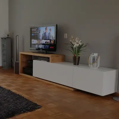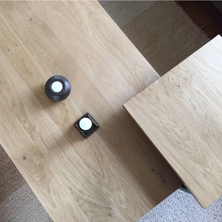 Een rustiek eiken meubelpaneel wordt standaard onbehandeld uitgeleverd met open noesten en scheurtjes, "scherpe kanten" en wordt geschuurd (fijne korrel)