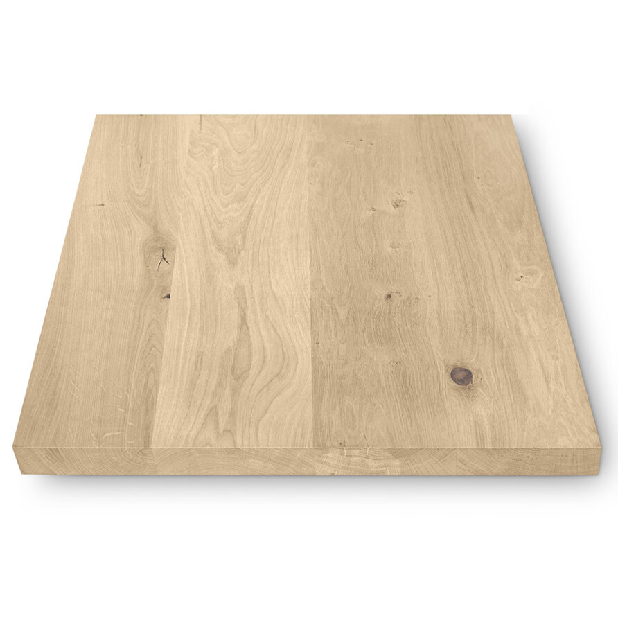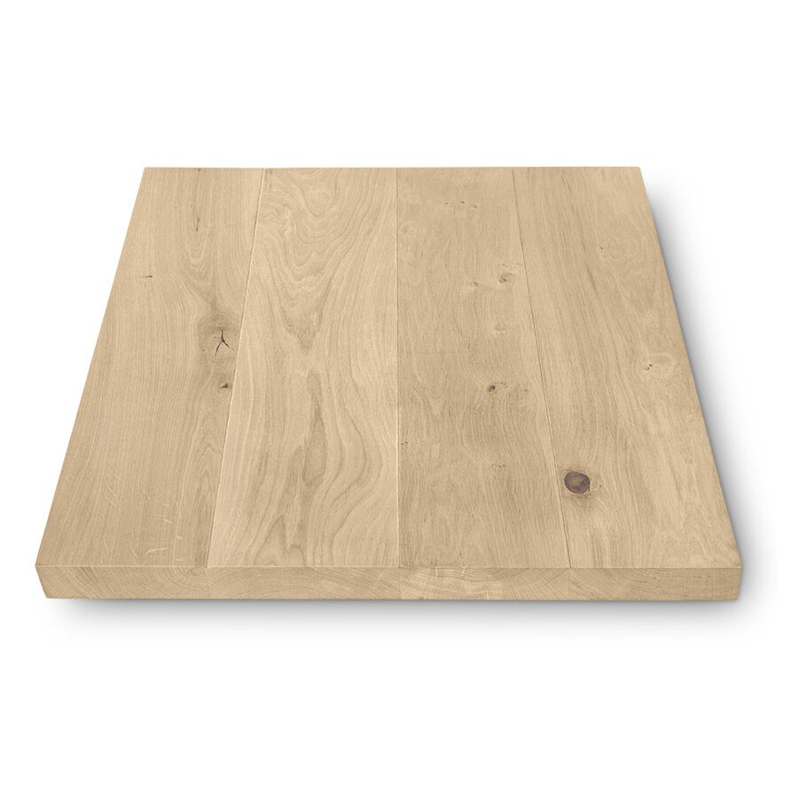 Eiken (horeca) tafelblad - in diverse (kleinere) afmetingen - 4 cm dik - rustiek eikenhout - met noesten & scheuren - massief eiken (1-laags) - met doorlopende lamellen - KD 8-12% voor binnengebruik. Onze verlijmde eiken tafelbladen zijn handgemaakt en - in de meest gevraagde & populaire afmetingen - in zijn geheel verlijmd, geschaafd en geschuurd. Deze eikenhouten tafelbladen hebben een dikte van 40 mm en bestaat uit 1 laag massief eiken. Bovendien zijn er altijd doorlopende lamellen in de lengte. De breedte van de lamellen varieert tussen de 6 en 12 cm.