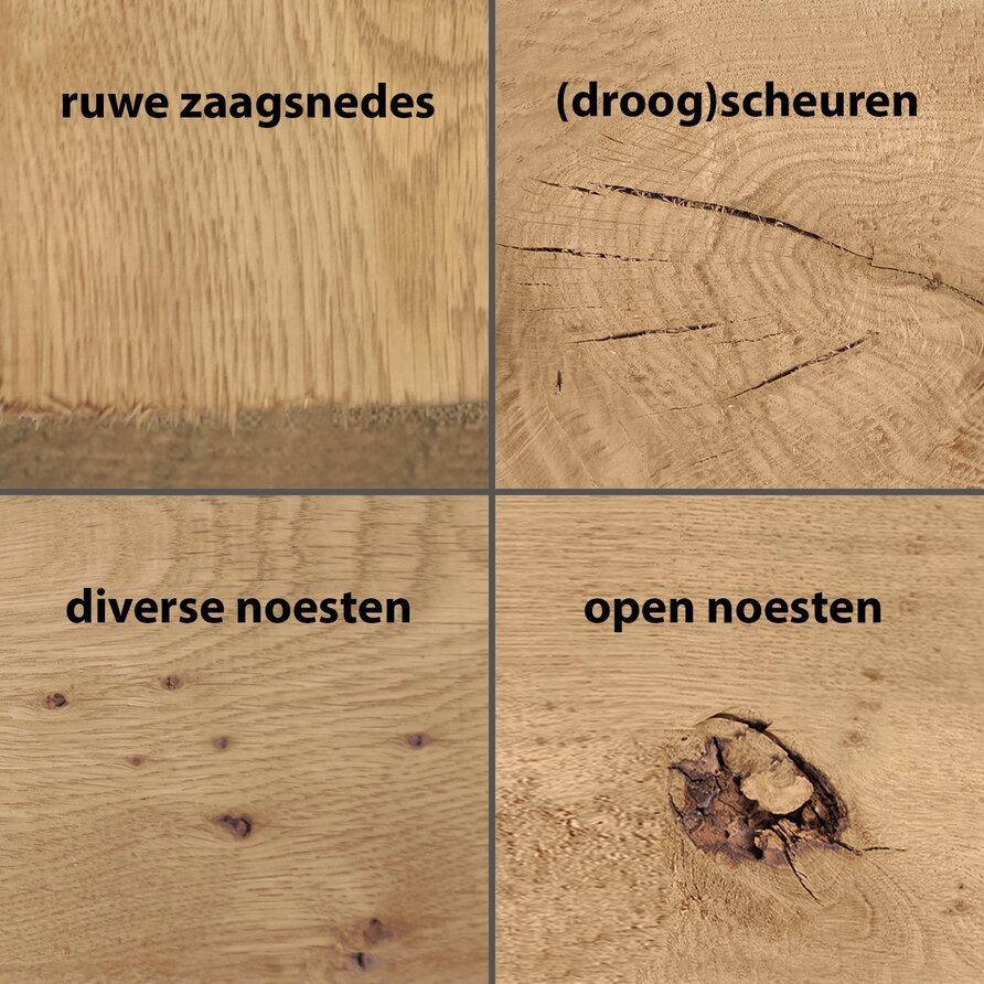 Wij leveren tuinhout, dat nog bewerkt & verwerkt zal worden. Rustiek eikenhout werkt relatief veel, is vrij vlekgevoelig & bevat noesten, scheuren en mogelijk ook wat onaangetast spint & ingesloten hart. Het eikenhout heeft ruwe uiteinden (ingekort met kettingzaag) en een overlengte van 1 - 10 cm. Geschaafd hout is - t.o.v. ruw / fijnbezaagd hout - glad & vrij vormstabiel, houd wel rekening met geringe maatafwijkingen door werking van het hout. Het betreft 'droog' KD 8-12% hout - oftewel kunstmatig gedroogd hout met een vochtpercentage van 8-12% - geschikt voor het binnenwerk van tuinobjecten & toepassingen binnenshuis. Eikenhout is dan ook echt voor de echte liefhebber!