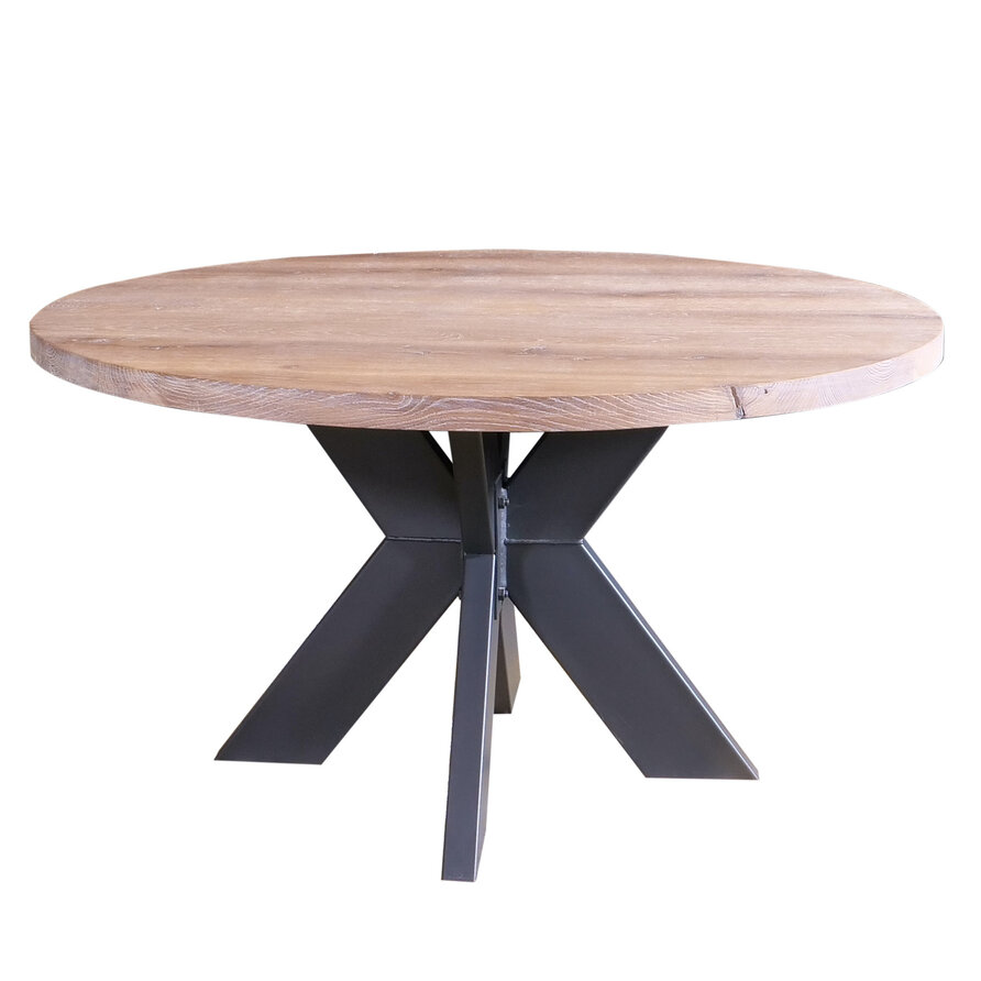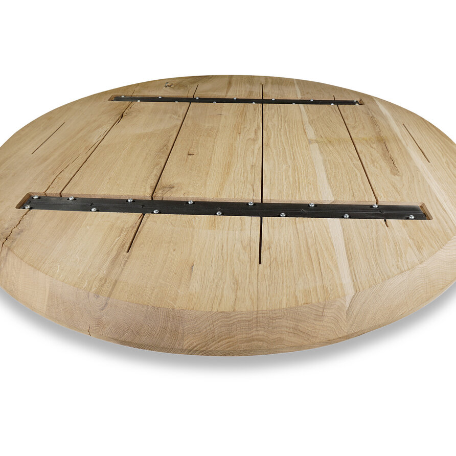 Dit rustieke ronde eiken tafelblad wordt standaard onbehandeld uitgeleverd met open noesten en scheurtjes, "scherpe kanten", (met fijne korrel) geschuurd en wordt altijd voorzien van staalprofiel & sleuven aan de onderzijde (om vervorming/kromming te voorkomen).