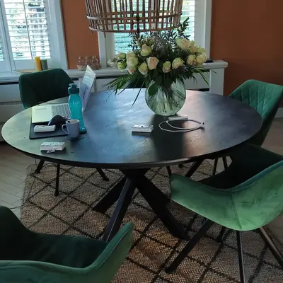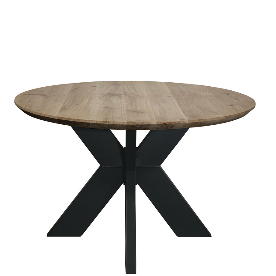 Dit rustieke ronde eiken tafelblad wordt standaard onbehandeld uitgeleverd met open noesten en scheurtjes, "scherpe kanten", (met fijne korrel) geschuurd en wordt altijd voorzien van staalprofiel & sleuven aan de onderzijde (om vervorming/kromming te voorkomen).