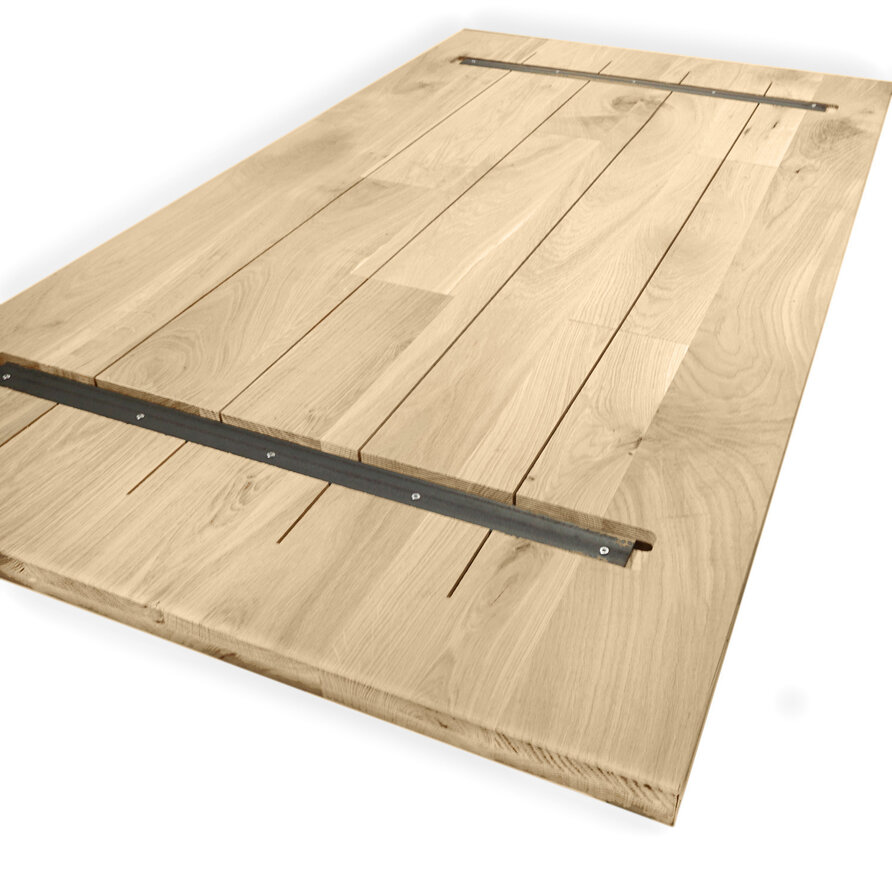 Eiken tafelblad (voor binnen) - in diverse vaste afmetingen - massief eikenhout - rustiek KD 8-12% - 4 cm dik (1-laags) - ambachtelijk verlijmd eikenhouten tafelblad - met doorlopende lamellen - optioneel: noesten gevuld, behandeld (olie/lak) + tafelblad Lees meer