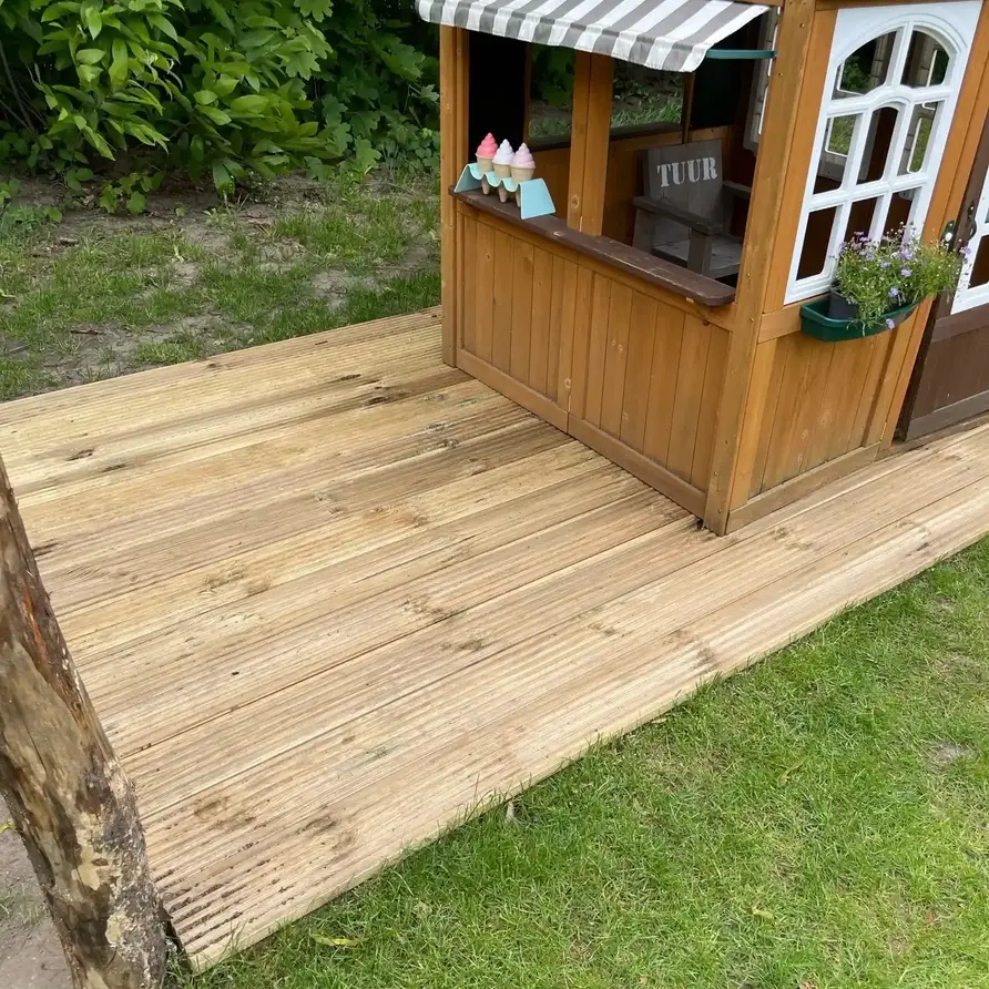 Een geïmpregneerd grenen terrasplank - 28x140 mm geschaafd is een sfeervolle gegroefde grenen terrasplank. Ideaal voor een mooi terras, vlonder & veranda van geïmpregneerd grenenhout. U bestelt een vlonderplank gegroefd / geribbeld van gedrenkt grenenhout (KD 18-20%) eenvoudig & voordelig online bij HOUTvakman.be, in diverse lengtes uiteraard. De geribbelde / gegroefde terrasplank (6-groefs) zorgt voor meer grip (antislipfunctie) en een betere waterafvoer. Met houten vlonderplanken realiseert u een duurzaam terras en voegt u sfeer toe! Geïmpregneerd grenen heeft een kenmerkende groene kleurtint en is tuinhout met een optimale prijs/kwaliteit verhouding. Keteldruk geïmpregneerd grenen kan flinke kleurverschillen vertonen binnen hetzelfde product, evenals groene stipjes / vlekjes. Behandelen is mogelijk, echter wordt gedrenkt grenen voor buiten veelal onbehandeld gebruikt, waardoor het vergrijst. Altijd een geïmpregneerd grenen terrasplank voor uw buitenproject bij HOUTvakman.be!