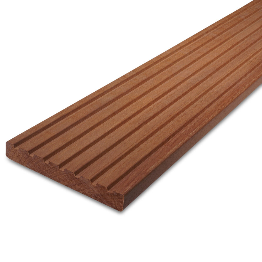 Een massaranduba terrasplank - 21x143 mm - geschaafd - AD is een sfeervolle gegroefde houten vlonderplank, ideaal voor een mooi terras, vlonder & veranda van het stijlvolle, duurzame & oersterke (D60) massaranduba hout. Massaranduba is extreem duurzaam (+ Lees meer
