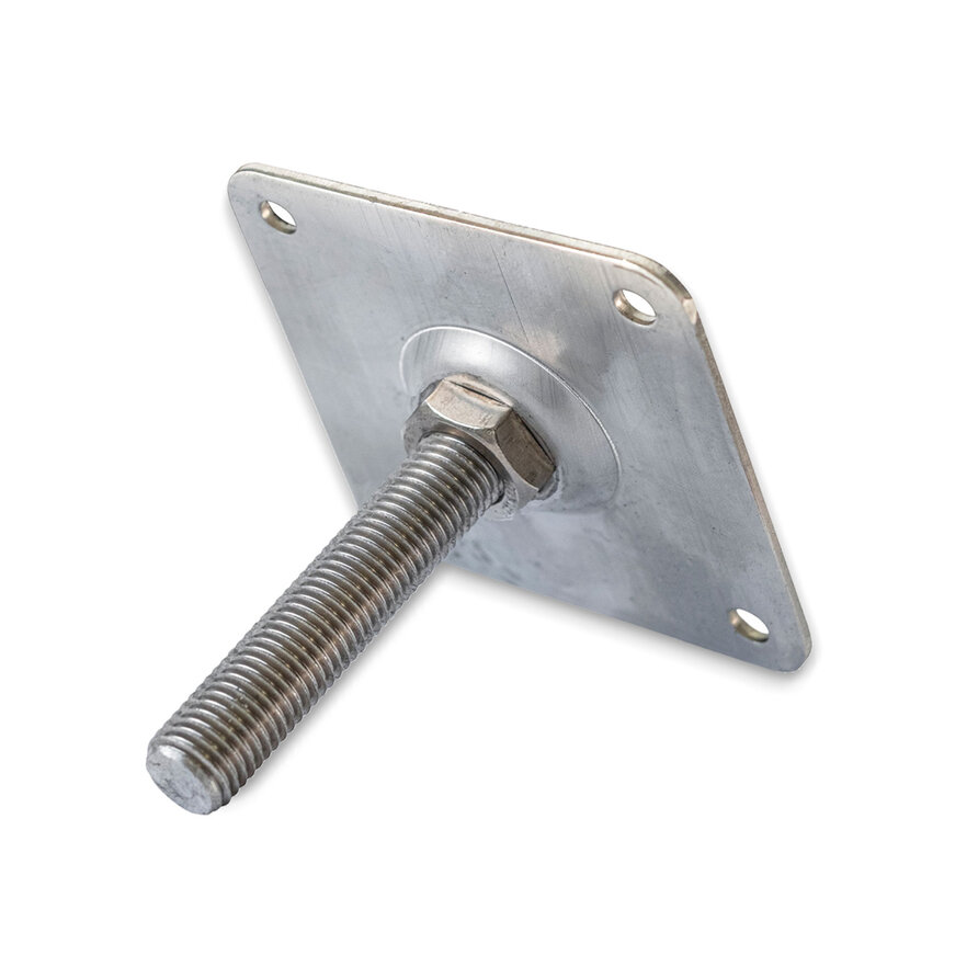 Stelplaat M20 - 10x10 cm - paaldrager hoogteverstelbaar - verzinkt. Deze stelplaat - ook wel verstelplaat of paalhouder genoemd - is gemaakt van een 3 mm dikke plaat met vier schroefgaten en een gelaste bout (met moer). Deze verstelbare paalhouder wordt gebruikt om houten palen op betonpoeren te bevestigen. Eerst wordt het stelplaatje met stevige schroeven of houtdraadbouten aan de paal bevestigd. Daarna wordt de paal met de stelplaat op de betonpoer vastgedraaid. Door het aandraaien van de bout kan de hoogte van de paal naar wens worden aangepast.