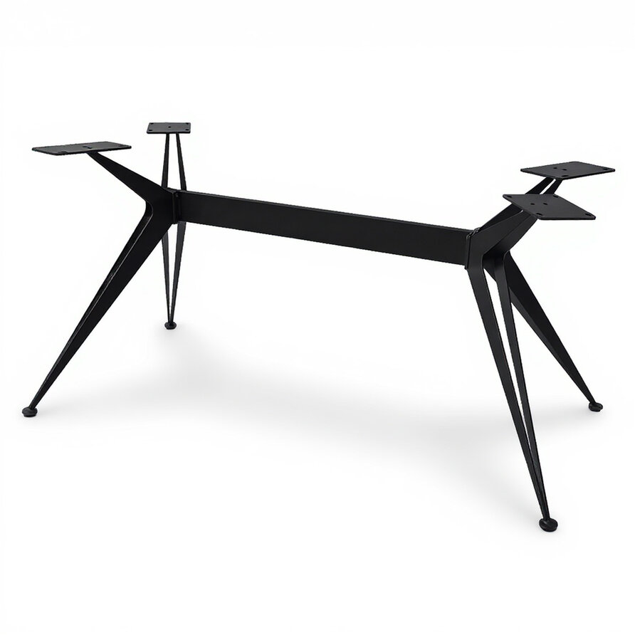 Een zwart tafel onderstel van metaal dat optisch lijkt op een 3D tafelpoten set, waarbij de verbinding zorgt voor extra stevigheid. Het 2 cm dikke staalprofiel geeft de poot een slank uiterlijk en het vlinderpoten frame zelf heeft een hoogte van 72 cm, een breedte van 90 cm en een lengte van 190 cm. De stang heeft een lengte van 100 cm. Dit bijzondere metalen tafelonderstel wordt met de hand vervaardigd en is geschikt voor rechthoekige (boomstam) & Deens ovale tafelbladen.