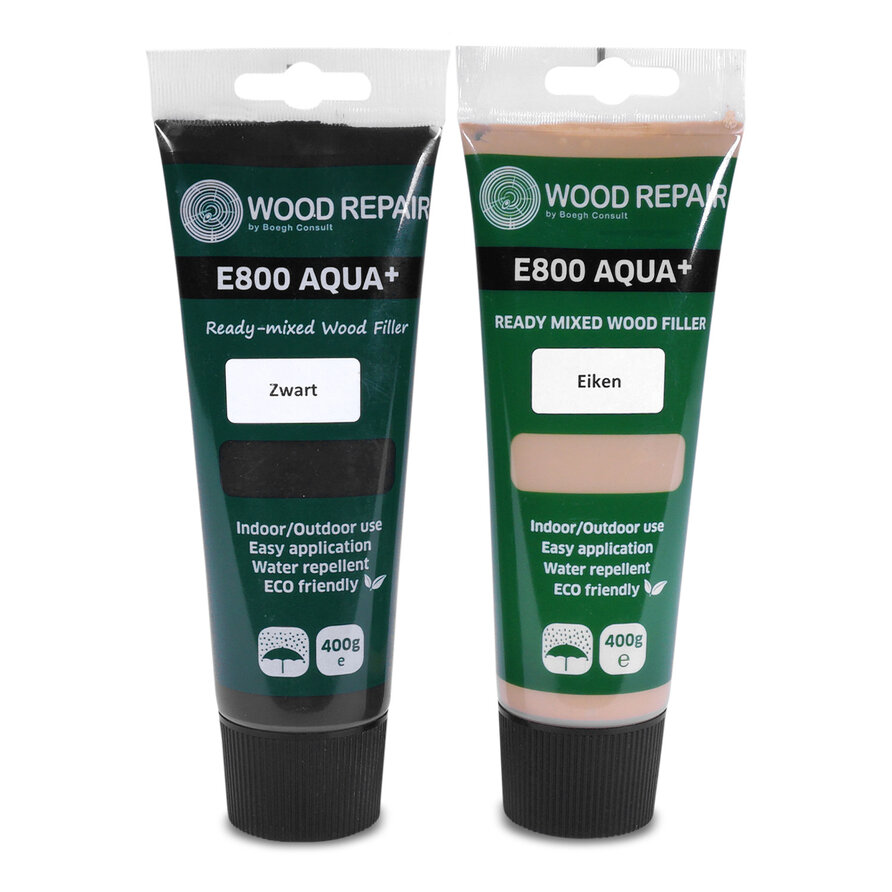 Wood Repair houtvuller - noestenvuller licht eiken & zwart - kant-en klare pasta - geschikt voor binnen & buiten - tube 400 gram. Onze hoogwaardige Wood Repair houtvuller is een fijnkorrelige pasta die speciaal is ontwikkeld om noesten en scheuren in hout perfect op te vullen. Verkrijgbaar in licht eiken en zwart, dezelfde kleuren als onze eiken (tafel)bladen met "noesten gevuld" optie. Deze knoestenvuller vult moeiteloos open noesten en scheuren tot 5 mm diepte in één keer. Diepere noesten of scheuren kunnen in meerdere lagen worden opgevuld met droogtijd tussen elke laag. Het opgedroogde resultaat kan indien gewenst worden behandeld met lak of olie.